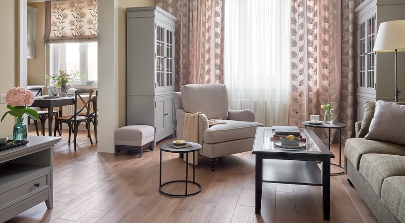 В этой квартире создано настроение загородного дома и присутствуют нотки английской классики, но не тяжелой с клеткой и темными тонами, а светлой и легкой.