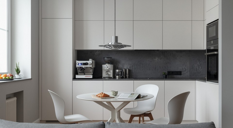 Для отделки стен во всех жилых комнатах, кухне и прихожей выбрали декоративную штукатурку серого цвета. По словам Владимира, сначала сделали выбор в пользу матовой краски, но после решили, что она не совсем подходит по качеству и устойчивости декоративная штукатурка практичнее и не пострадает от мелких царапин и других повреждений. На полу в комнатах и даже в зоне кухни инженерная доска из дуба, уложенная елочкой. Такой способ укладки больше характерен для классических интерьеров, но в скандинавском дизайне его часто применяют. Он добавляет пространству традиционной атмосферы. В мокрых зонах и прихожей использовали крупноформатный керамогранит светлого цвета под камень.