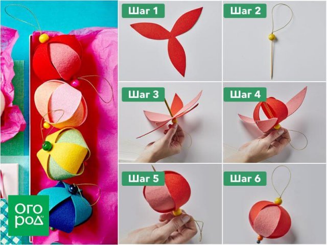 Украсьте дом разноцветными винтажными фонариками! Распечатайте представленный ниже шаблон, обведите на листе фетра, вырежьте и соберите по инструкции на картинке. Помимо фетра, вам также понадобятся крупные бусины с большими отверстиями, плотная нить или шнурок с люрексом (можно использовать и нить мулине для вышивания) и иголка с широким ушком.