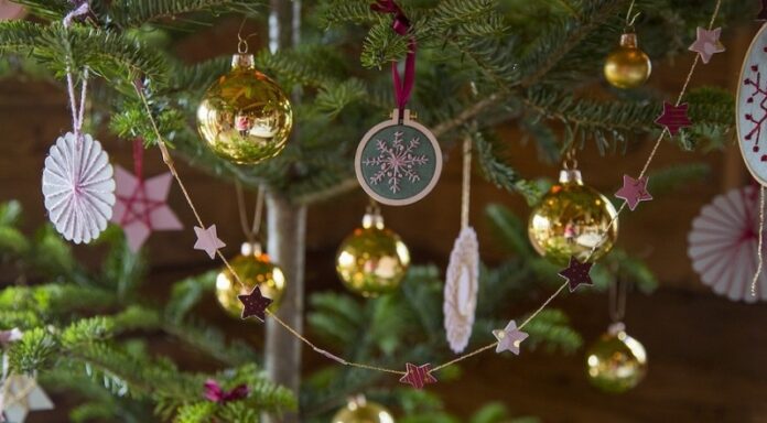 Традиционно на Новый год на окна приклеивают бумажные снежинки, также ими украшают и лесную гостью. Но можно не ограничиваться таким декором и сделать бумажные остроконечные звезды в скандинавском стиле, шары из тишью, объемные игрушки под елку из картона и т.д. Хорошо смотрятся и самодельные гирлянды из крепа или упаковочной бумаги.