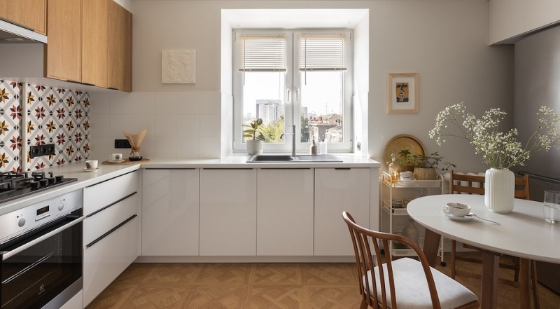 Вопрос перепланировки коснулся не только перегородок, но и расположения сантехники. В частности, мойку на кухне перенесли к окну. Это сделало конфигурацию удобнее, а еще элегантнее такое расположение нечасто увидишь в городских квартирах, тем более в домах прошлого века. «Главное, что нужно учесть при переносе мойки к окну, сделать хорошую теплоизоляцию стен под окном и выдержать требуемый уклон канализационных труб по всей длине от мойки до стояка», рекомендует Надежда.