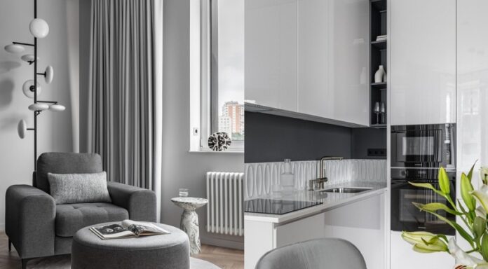 Думаю, этот проект прежде всего наше (мое и заказчицы) прочтение минимализма. Мы старались соблюсти чистоту линий, использовать только функциональные предметы, при этом выбирали такие модели, которые сами по себе выступают декоративными элементами, их интересно рассматривать. В квартире есть ощущение «воздуха», хотя площадь небольшая. Проект получился графичным, но в нем все же присутствуют нежные женские нотки. Например, в форме плитки на фартуке кухни, которая так хорошо смягчает темно-серую краску выше.