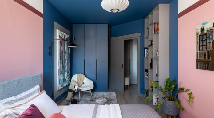 «Множество углов и неправильная форма помещений были проблемой этой квартиры. Цвет стал основным и самым важным инструментом для корректировки форм комнат. Основное сочетание цветов мы взяли из коллекции картин заказчицы: глубокий синий, чтобы цветом отрезать часть комнаты со множеством углов и замаскировать их. Пыльно-розовый в качестве основного, обволакивающего и мягкого цвета. Серый для мебели и дверей, что позволило нам сделать крупные объемы менее заметными. И в качестве акцента ягодно-бордовый цвет. В спальне белый потолок спускается на стену, что визуально расширяет площадь комнаты. Это было нужно, чтобы сделать ее более квадратной. Во всех помещениях мы использовали одну цветовую схему, но в разных соотношениях. Так как квартира небольшая, не хотелось ее дробить на разные участки. Одинаковые цвета позволили нам объединить зоны», комментирует дизайнер.