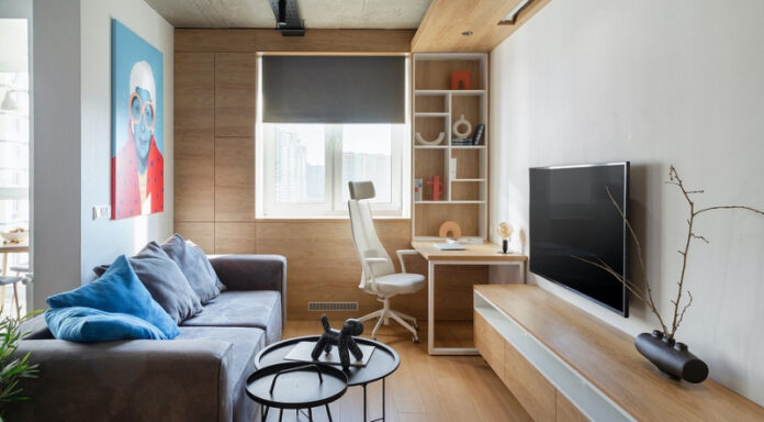 Как на небольшой площади оформить много функциональных зон? Этот пример квартиры из Минска покажет, что вполне реально уместить на 50 квадратных метрах зону гостиной в большим кинопроектором, спальню, рабочее место, а также комфортную кухню, столовую и гардеробную.