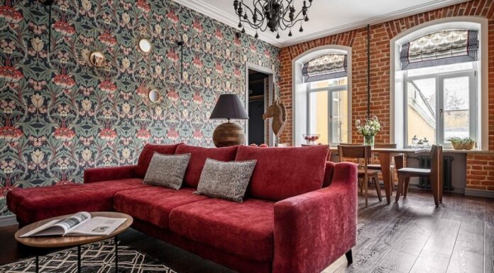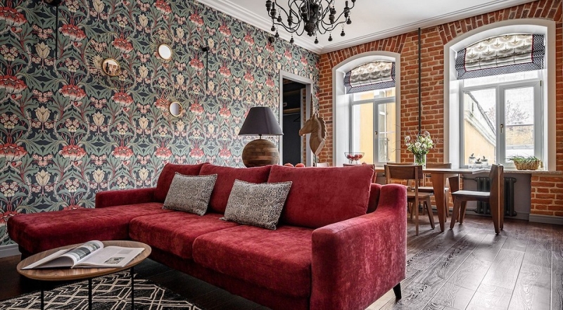 Открытый кирпич стал главной изюминкой отделки. По догадкам автора проекта, кирпич в гостиной-столовой может быть середины XIX века, на кухне и в ванной комнате более поздний конца XIX в. Часть кирпичной кладки оставили и в спальне. Большая стена в гостиной оклеена яркими обоями с рисунком в стиле Уильяма Морриса, ниши окрашены.