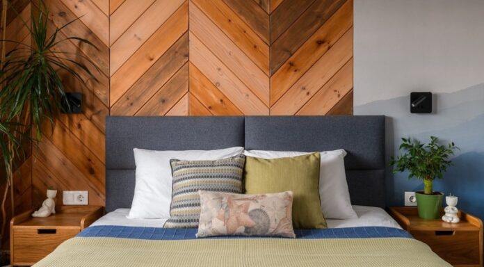 Стену за кроватью в спальне украсили панно из имитации бруса, которое сделал супруг Наталии своими руками, а также фотообоями с рисунком гор. «Это как будто окно в мир путешествий и красивых пейзажей. Путешествия важная и неотъемлемая часть нашей жизни, и нам было важно, чтобы в интерьере это тоже было отражено», комментирует выбор дизайнер.