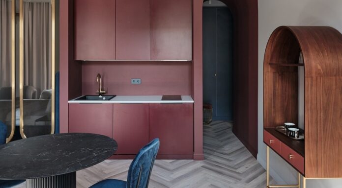 Реализация проекта оказалась возможной благодаря длинному и широкому коридору. Именно на его площади без нарушения действующих норм разместили мокрые зоны второй квартиры: кухню и санузел. Межкомнатные перегородки были ненесущими, что позволило их демонтировать и организовать пространство по-новому.