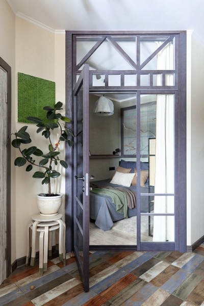 Проект Екатерины Бубновой яркий пример перепланировки, в результате которой из однокомнатной квартиры получилось фактически двухкомнатная. К единственной комнате присоединили площадь кладовки и разделили пространство на два: в той, что ближе к окну, организовали спальню сына. Там, где окна нет комната хозяйки, но недостаток естественного освещения компенсируется высокими стеклянными дверями, так что свет все же попадает в спальню. Предусмотрена также принудительная вентиляция. Чтобы уместить столовую зону, перегородку между кухней и комнатой немного подвинули.