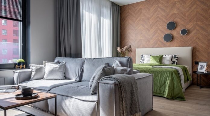 Акцентную стену спальни украсили ламинатом контрастного оттенка под «французскую елку». Выразительная отделка обозначает функциональную зону, но не всегда находится в поле зрения, а значит, не будет надоедать. Остальные вертикальные поверхности выровняли и покрасили. Кондиционер разместили на перегородке напротив кухонного полуострова.