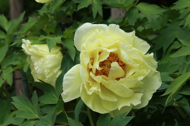 Цветки полумахровые и махровые, розовидные, диаметром 15-25 см, нежно-желтые с золотистыми тычинками, с бархатистыми лепестками, с тонким нежным ароматом.