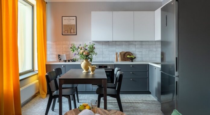 Здесь солнечные шторы будут очень к месту. Мы уже говорили, что этот цвет повышает аппетит. Так что семейные обеды станут вдвойне приятнее.