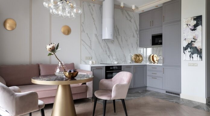 Так как квартира небольшая, одно цветовое решение было использовано для всех помещений — светло-серый фон стен с бежевыми молдингами. Мягкая мебель серо-бежевого, молочного или пыльно-розового оттенка, серый кухонный гарнитур, серо-розовая кровать и прикроватные тумбочки. Все спокойные цвета аккуратно подчеркнуты латунными элементами фурнитуры, отделок и декора.