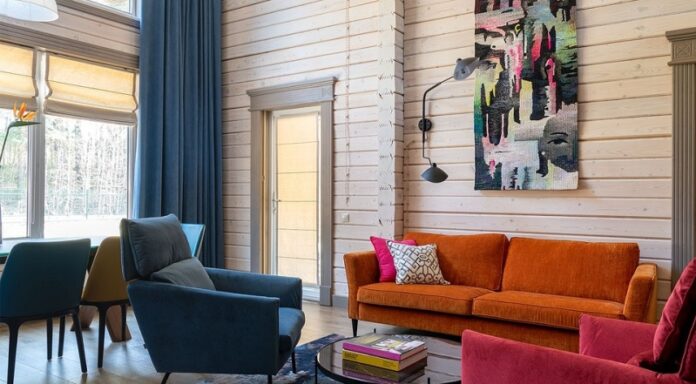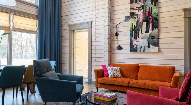 Мебель яркого цвета, она отлично смотрится на нейтральном фоне деревянных стен. Это и коралловый шкаф в спальне вместе с синей обивкой кровати.