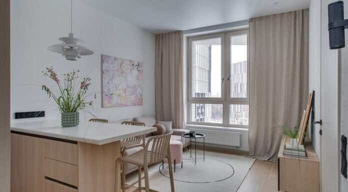 В небольшом пространстве удалось вместить впечатляющее количество функциональных зон. Причем интерьер выглядит просторным за счет выбора светлой отделки и мебели.