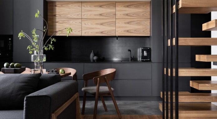 Ее скомбинировали с белой краской, чтобы высокие потолки смотрелись более гармонично, а также с деревянными рейками и зеркальным полотном в прихожей. В детской использовали для отделки декоративный кирпич, окрашенный в черный цвет. Его тоже скомбинировали с краской и штукатуркой.