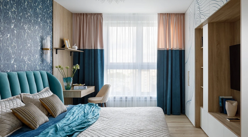 Красиво оформить пространство за изголовьем кровати можно с помощью акцентных обоев. Смело выбирайте контрастный оттенок или активный принт (а можно и то, и другое). Комбинации отделки могут быть самыми разными. Среди наиболее популярных сочетание голубого и бежевого, яркий орнамент в сочетании с однотонными стенами, геометрический узор рядом с цветочным. Чтобы акцентные обои не выглядели в интерьере инородно, подчеркните их цвет или стиль текстилем и декором.