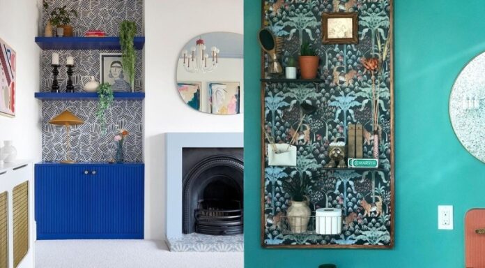 Подобные ниши часто обустраивают на манер книжных шкафов устанавливают открытые полки сверху и комод снизу. Здесь поступили так же, выбрав насыщенный синий оттенок. Его глубину и яркость подчеркивают обои, которые поклеили на «заднюю стенку» импровизированного шкафа. Их абстрактный хаотичный рисунок приковывает взгляд и сам по себе становится декоративным элементом. На полках расставили растения, аксессуары и вот это уже не ниша, которую сложно обыграть, а настоящий интерьерный акцент.