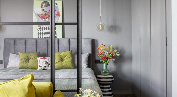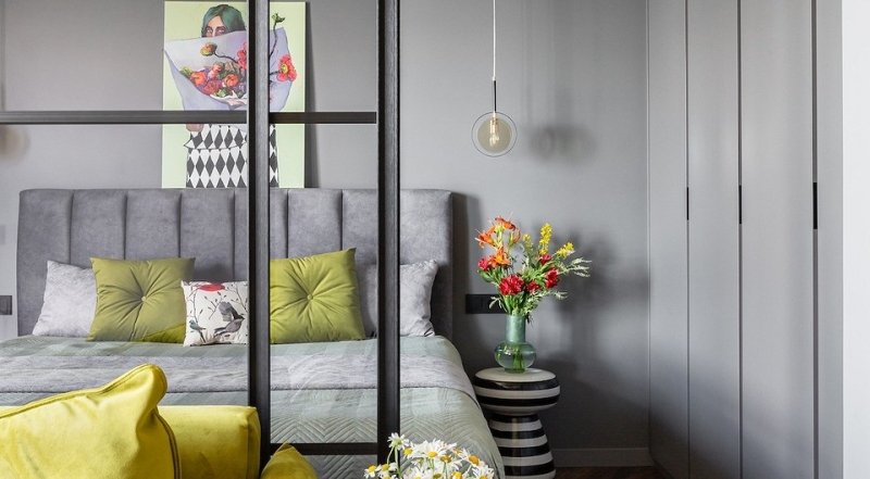 В целом, интерьер выполнен в современном минимализме. Но благодаря декору мы пошалили в хорошем смысле этого слова, показав, как искусство и небольшие детали преображают интерьер. Можно брать на заметку. Интерьер — как холст, на котором можно писать яркими красками под настроение. Темный серый цвет стен у нас служит таким холстом, где яркими пятнами выступает мебель. И особенно сочно вписываются картины от художницы Натальи Липской. Они задают особое настроение и придают свой шарм всему интерьеру. В спальне выбраны более спокойные оттенки зеленого, которые перекликаются с текстилем, картиной. Весь декор спальни собирался вокруг картины — именно она задала все настроение и цвета, случайно совпав по цвету с выбранным ранее покрывалом на кровать. Искусство — это прекрасно, и авторские картины способны вдохнуть особенную изюминку в интерьер, поэтому я всегда обращаю внимание своих заказчиков на такие детали.