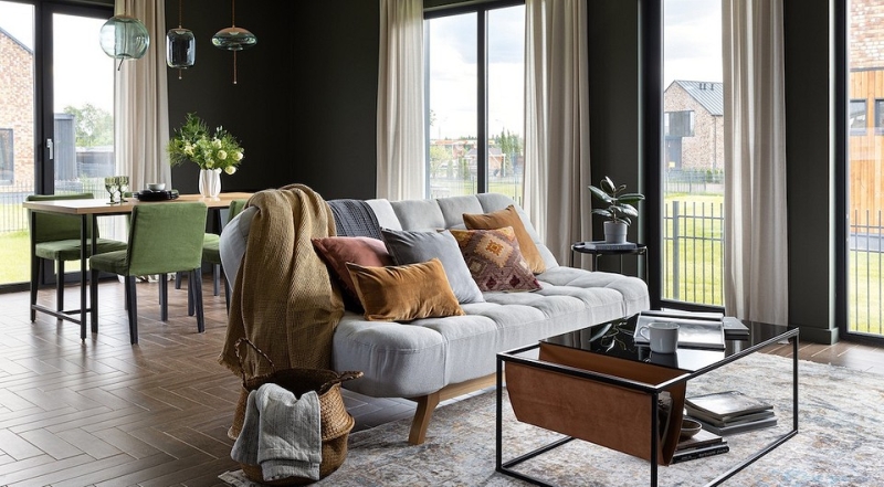 Мы не привязывались к какому-то конкретному стилю — мужу хотелось больше брутальности, а жене — классики в европейских традициях. Однако заказчики были открыты к экспериментам и полностью нам доверились. Дорога к поселку идет, фактически, через лес, и мы предложили сделать дом продолжением природы — использовать природные тона, темные насыщенные цвета, натуральные материалы и живые растения, чтобы создать расслабленную, немного богемную атмосферу, смешав природные текстуры с современным искусством, а классические элементы с этническими мотивами. Получилась смесь современного стиля с классическими элементами, этническими и экомотивами.