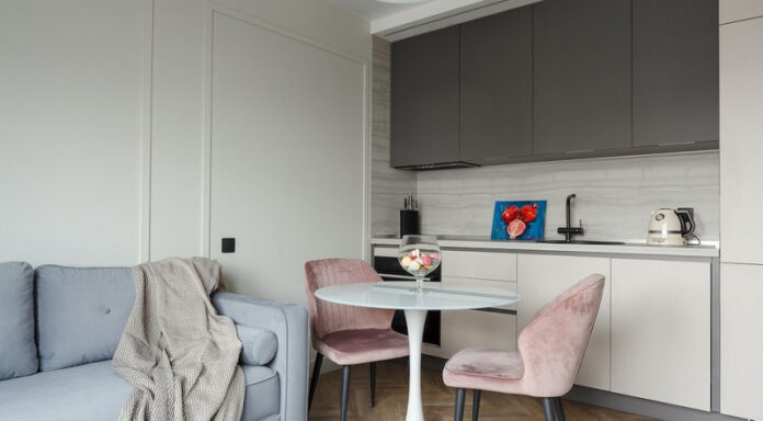 По изначальному плану в студии были отделены прихожая и ванная комната. Перепланировка заключалась в том, чтобы убрать перегородку между прихожей и комнатой, а также построить стенку для встройки кухонного гарнитура. Ванную комнату же оставили в своих границах.