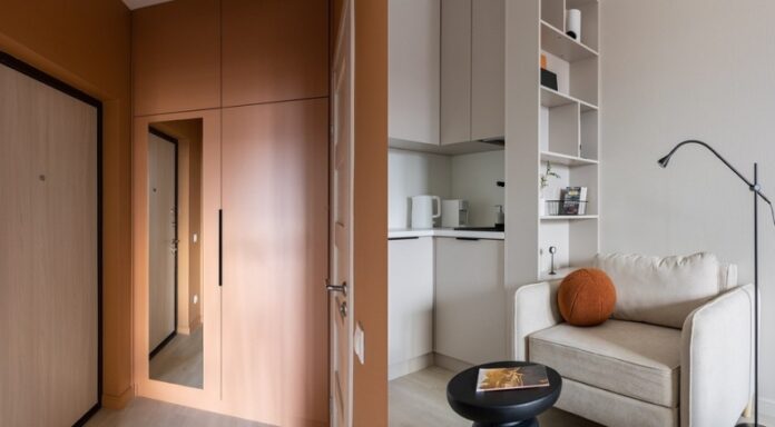 Вдохновением для выбора цвета прихожей стали ЛДСП-панели для шкафа. И краску для стен подобрали под эти панели. Сделать яркую прихожую почти всегда удачное решение. Она не надоест, так как там человек не задерживается, к тому же из комнаты можно даже закрыть дверь. Зато яркий акцент там на фоне монохромной бежевой комнаты выглядит очень уместно. И даже сама комната человеку, выходящему из яркой прихожей, может показаться визуально больше.