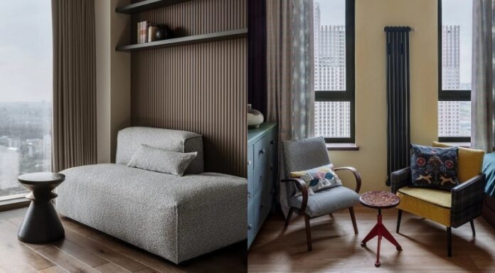 Еще один пример с креслом, только в этом случае отказ от дивана обусловлен не просто маленькой площадью жилья, но и сложной планировкой. Например, у этой квартиры два угловых эркера, которые расположены друг за другом. В одном из них обустроили небольшую гостиную зону, состоящую из кресла, пуфа и столика. Компактную мягкую группу дополнили круглым ковром и напольным светильником интересной формы. Так удалось сгладить сложную архитектуру и максимально задействовать имеющееся пространство. Квартира оформлялась для одного человека, и такой зоны отдыха хозяйке достаточно.