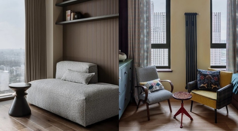 Если в квартире панорамное остекление или просто красивый вид из окон, можно сделать зону отдыха их продолжением. Например, как в этом проекте, где отдельной комнаты для гостиной не предполагалось. Небольшую оттоманку поставили у окна на кухне, причем форма мебели такова, что удобно наблюдать за пейзажем и сидя, и лежа. Мини-диванчик выступает в роли зоны отдыха, но его также можно использовать как дополнительное место для гостей.