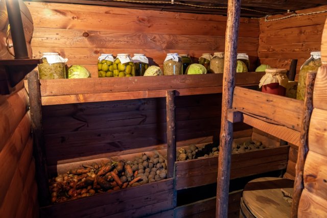В самом низу подвала или кладовой, на полу, обычно помещают один большой или несколько небольших встроенных или отдельно стоящих ящиков для хранения сырых овощей – картофеля, моркови, свеклы и т.д. Над ними традиционно обустраивают полки для прочего свежего урожая, а также маринованных овощей, закатанных салатов и других видов консервации.