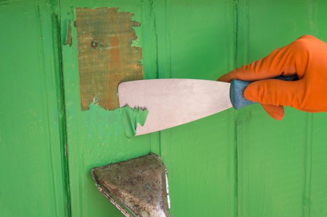Сильно облупившееся лакокрасочное покрытие на малоценных деревянных поверхностях можно счистить обычным шпателем, не прибегая к смывке старой краски.