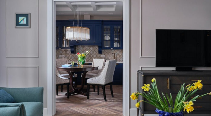 Стиль, который предполагает массивную мебель и объемный декор, сумели адаптировать под небольшую площадь этой двухкомнатной квартиры. На светлом фоне стен выделяются синие акценты их активно использовали в мебели.