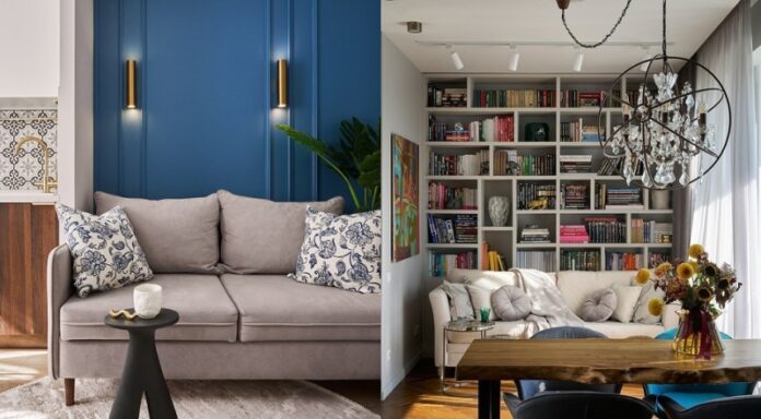 В проекте Ирины Беловой гостиная объединена с кухней. И диван стоит спинкой к книжному шкафу. Шкаф выстроен во всю высоту и ширину стены. Конечно, красивый эффект создает и расстановка книг и декора на полках. Без продуманного расположения не получилось бы такой стильной картинки. Если захотите повторить, придется учитывать, что надо поддерживать порядок на полках.
