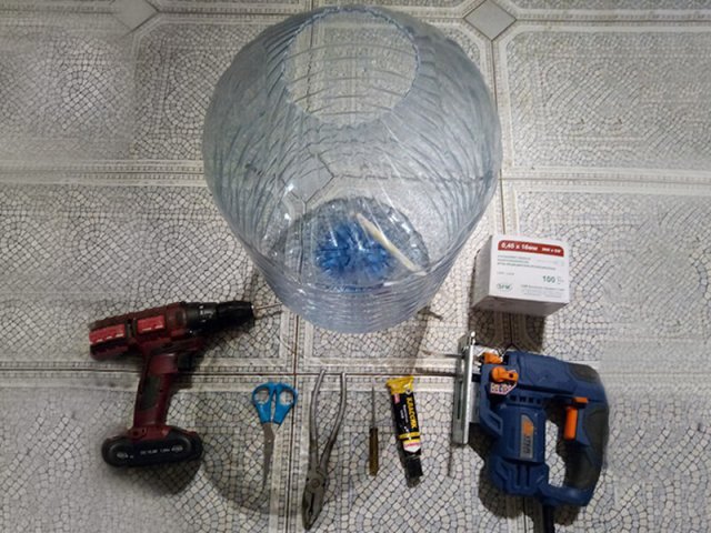 В нижней части бутылки (но не очень низко) шилом проколите отверстие, а после расширьте его с помощью шуруповерта.