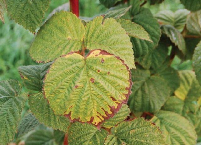 Такие следы на малиновых листьях говорят о нехватке калия