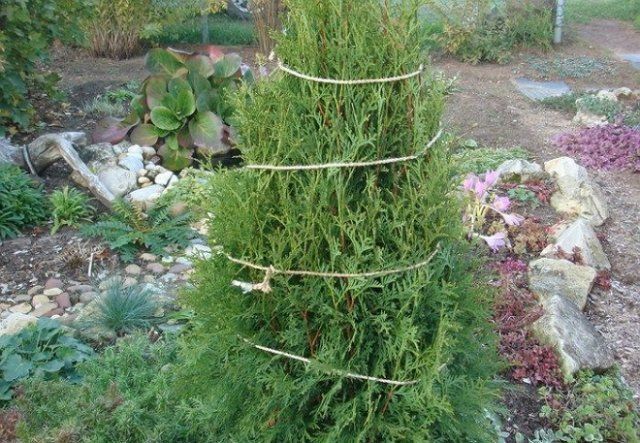 Для того чтобы ветер и мокрый снег не наклонил и не погнул молодое, но высокое растение, надо укрепить его растяжками. Это относится к хвойным культурам, выращиваемым на штамбе.