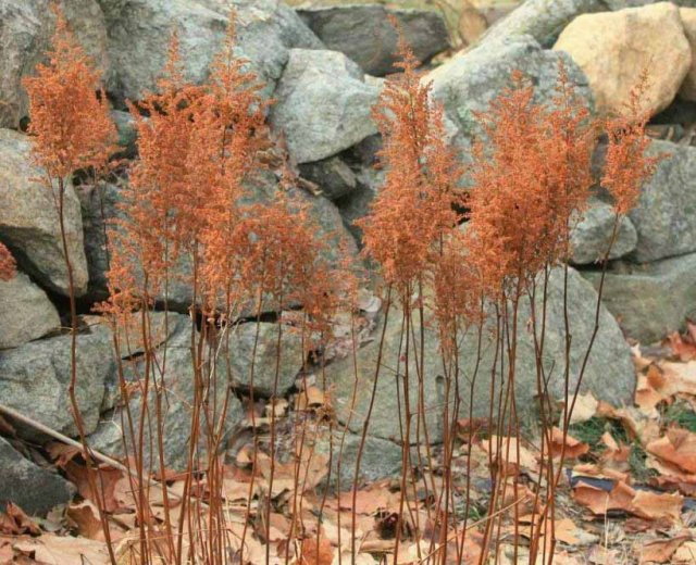 Отцветшая астильба нуждается в вашем уходе. После первых осенних заморозков, в октябре-ноябре, когда листья и стебли растения начнут чернеть, пора проводить обрезку. Срежьте всю надземную часть на уровне почвы, уберите и сожгите засохшие листья. Теперь пора подумать о теплом укрытии.