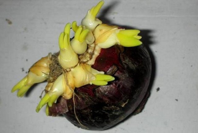 С момента отправки маточных луковиц на хранение и на протяжении всего времени формирования луковичек растения нужно раз в неделю обрабатывать раствором перманганата калия насыщенно-розового цвета. После этого растения высаживают в плошки донцем вверх, а по весне пересаживают в открытый грунт.