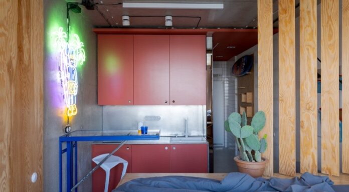 Владелец этой студии в одном из жилых комплексов Ростова-на-Дону дизайнер Юрий Луценко. Квартира находится на 20-м этаже, и из окон открывается отличный вид на реку Дон. Для туристов, которые часто проезжают город по пути к морю, Юрий и обустроил эту квартиру. «Нужно было сделать ее максимально привлекательной, уникальной и практичной, антивандальной», говорит дизайнер.
