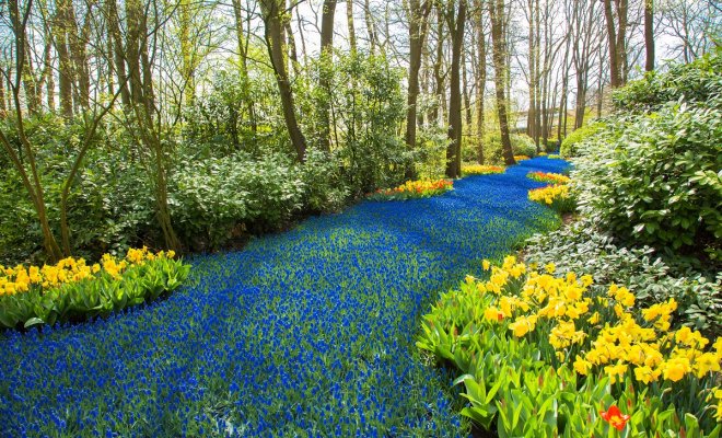 Самый простой вариант – просто высадить выбранные растения неширокой извилистой лентой, например, между деревьев в саду. Такой «поток» дополнительно можно отсыпать по периметру узкой полоской гальки, коры или щебня либо такой же полоской контрастных по цвету растений, чтобы «ручей» не сливался с окружающим пейзажем, а цветы из него со временем не «убежали» по сторонам.