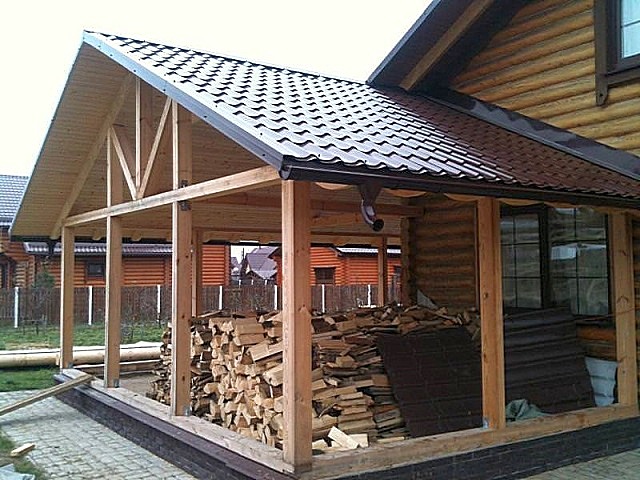 Пристройка состыкована с торцевой стеной дома, и над ней возведена двускатная крыша