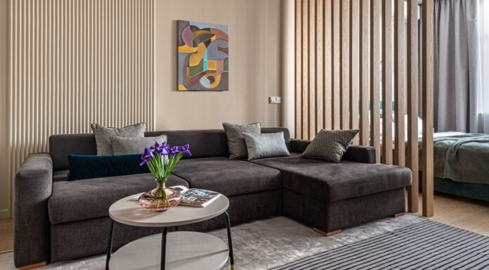 Изначальную планировку семья менять не хотела, она устраивала их. Здесь три изолированные комнаты, кухня площадью почти 9 квадратных метров, большая прихожая и раздельные санузел с ванной комнатой. Для родителей и каждого ребенка нужны были отдельные спальни, и комнат хватало для этого. Но дизайнеры решили не лишать семью общей гостиной зоны, и самую большую комнату разделили на спальню родителей и гостиную. Спальную зону разместили у окна, гостиную же ближе к выходу. Зонирующим элементом стала декоративная реечная перегородка.
