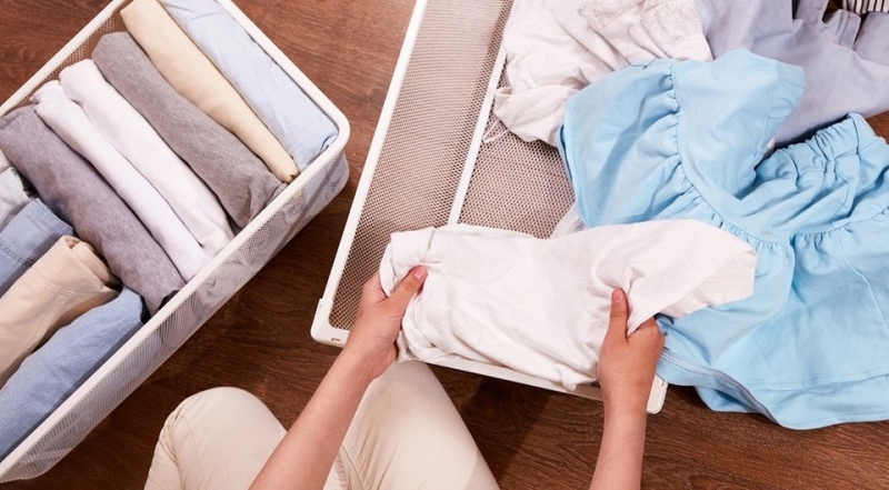 Быстрый способ сложить одежду компактно и при этом избежать заломов и сильной помятости свернуть ее в рулоны. Так можно хранить вещи где угодно: на открытых полках, в чемодане или органайзере, в коробке или под кроватью. При этом место расходуется рационально, а ваша одежда даже через несколько месяцев будет выглядеть прилично