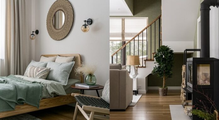 Для отделки стен дизайнер и заказчики выбрали обои. «Клиентам хотелось мягкости, уюта, поэтому мы выбирали обои с принтом под мелкую ткань. Она эффектно смотрится при естественном свете или дополнительной подсветке как натуральный материал», рассказывает Анастасия. В хозяйской спальне дополнили обои деревянной вагонкой и балками. Заказчики хотели добавить уюта, решили сделать это с помощью дерева. На полу клеевая пробка.