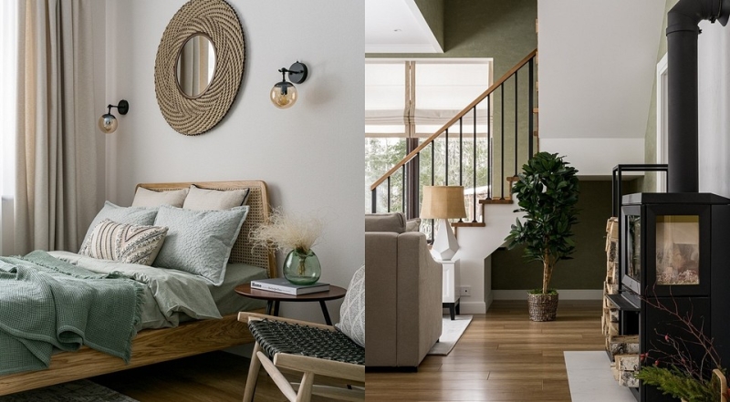 В доме много больших окон, именно поэтому окружение (рядом река Кама) гармонично вошло и в интерьер. Спокойная, природная гамма обволакивает и дарит невероятный покой. Обилие текстиля с разными фактурами придает интерьеру мягкость и уют. На этом объекте нам это было необходимо. В спальнях второго этажа есть «Нарния», это я бы отнесла к секретам интерьера. Из-за того, что крыша имеет скос, у нас образовались дополнительные системы хранения, которые мы скрыли за дверями-невидимками. В одной из спален второго этажа вместо привычной картины (или какого-то другого более стандартного декора) в изголовье кровати мы разместили слэб дерева. Подобрали интересную живописную форму, нет ничего лучше, чем то, что создала сама природа.