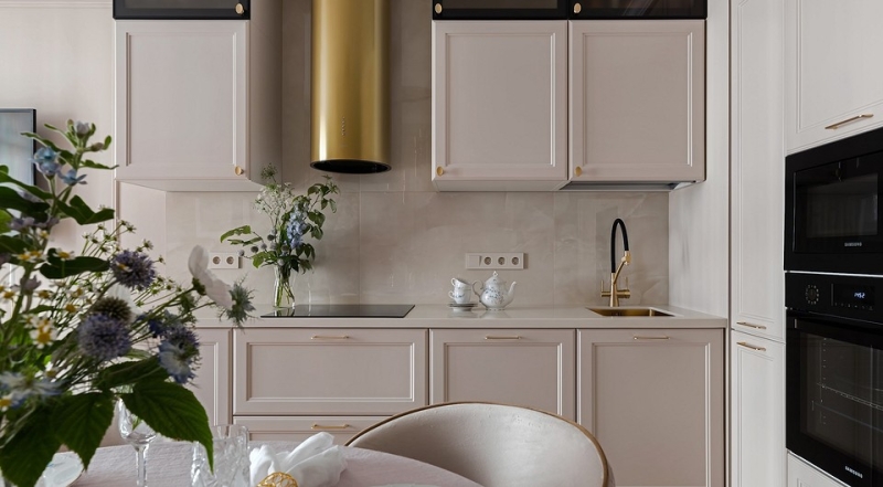 На кухне вместительный линейный гарнитур, дополнительно есть шкафы-колонны со встроенной техникой и местом для хранения. В зоне гостиной ограничились тумбочкой под телевизор.