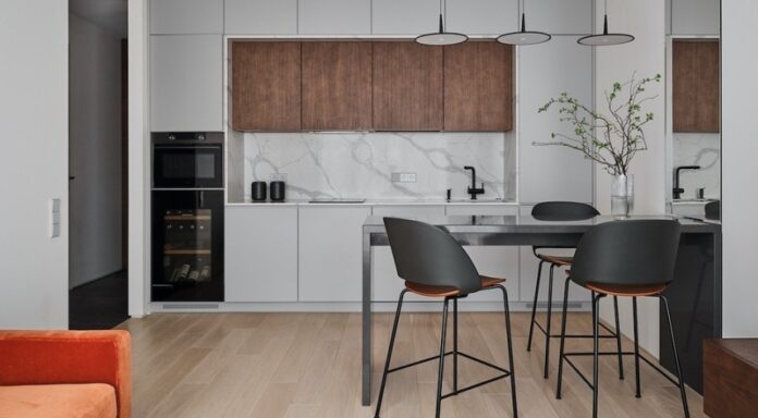 Кухня, гостиная (объединенные), спальня, гардеробная, постирочная в этой квартире продумали все до мелочей и создали минималистичный, комфортный и функциональный интерьер для семейной пары.