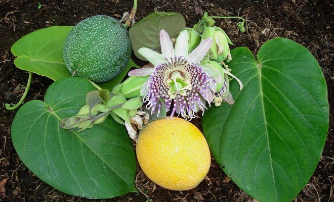 Пассифлора съедобная (страстоцвет съедобный) – вечнозеленая лиана длиной до 10 м с крупными очередными темно-зелеными глубоко-трехлопастными листьями и некрупными (до 3 см в диаметре) одиночными цветками. Плоды этого страстоцвета именуются пурпурной гранадиллой – они продолговато-яйцевидной формы, желтой или фиолетовой окраски, душистые, насыщенного кисло-сладкого вкуса.
