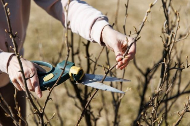 До начала сокодвижения и распускания почек проведите обрезку кустов. Все работы нужно выполнять при положительной температуре не ниже 5°С. Острым и чистым секатором удалите сухие, подмерзшие, сломанные, больные, загущающие куст побеги. Соберите их и сожгите, чтобы избежать распространения возможных болезней и вредителей.