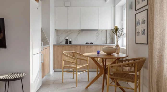 Далеко не всегда обеденную группу размещают там же, где готовят: зачастую маленькая площадь этого не позволяет или просто хочется собираться за столом в общей гостиной.