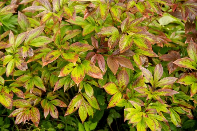 Некоторые неопытные цветоводы торопятся и надземную часть куста обрезать сразу после цветения, но это ошибочный подход. Зеленая масса нужна пионам для фотосинтеза и продолжения вегетации – именно за счет листьев происходит питание куста, развитие корневой системы и накопление запаса веществ, необходимых для зимовки. К тому же слишком рано обрезанные пионы при теплой осенней погоде могут выпустить молодые побеги, которые гарантированно погибнут зимой. По этим причинам полноценную обрезку следует отложить на более позднее время.