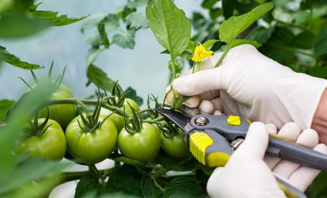 В теплице цветки на детерминантных и супердетерминантных томатах можно не трогать, а дать им возможность порадовать вас осенним урожаем пусть и не очень сладких плодов. Регулярно стоит удалять на них только пасынки второго порядка, чтобы плоды и на боковых побегах тоже успели вызреть.